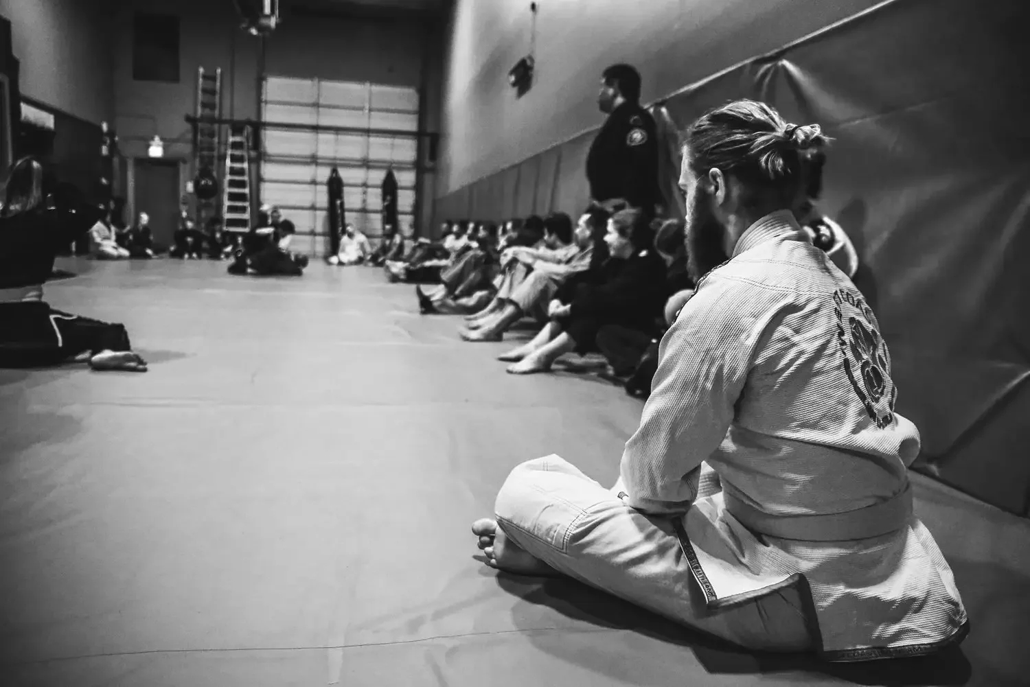 Group photo of people in a gym with workout equipment, some standing, some sitting or kneeling, with a dog in front, black and white image.